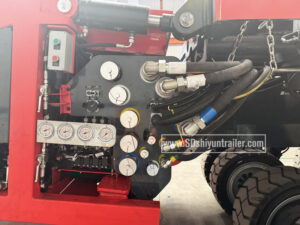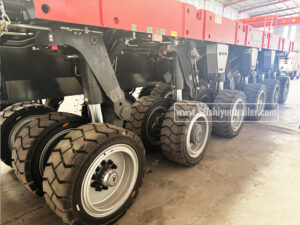 Our SYZ2430 model SPMT is available in 4-axle or 6-axle modular configurations, both integrating core components including a frame, steering system, hydraulic suspension system, hydraulic piping system, drive system, braking system, wheel system, and electrical control system. The frame of both modules is welded from Q690E high-strength steel plates with a triangular main beam structure for enhanced durability. Equipped with a rack and pinion cylinder-driven steering system, they offer a steering angle range of -100° to +130° for exceptional maneuverability. Their hydraulic suspension systems use cylinders to adjust frame height, providing a 700mm frame travel, while the hydraulic lifting system features a zone function that allows flexible division of the hydraulic suspension into 3 or 4 zones with easy configuration switching. The braking system is cylinder-controlled for reliable performance, with the 4-axle module’s drive system adopting a hydraulic motor combined with a lifting mechanism and the 6-axle module’s drive system utilizing a hydraulic motor paired with a reducer.